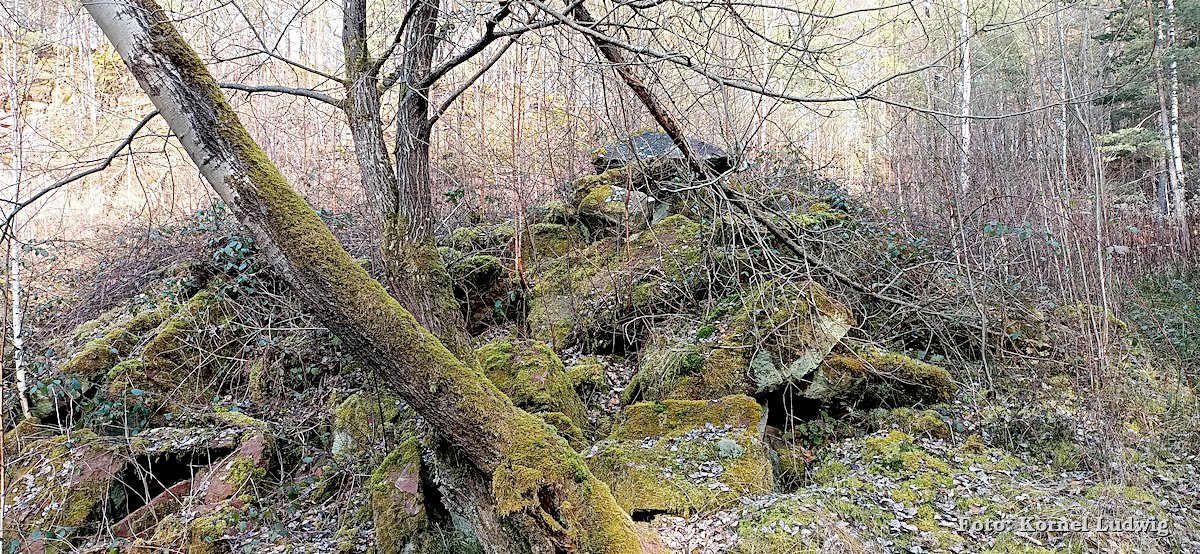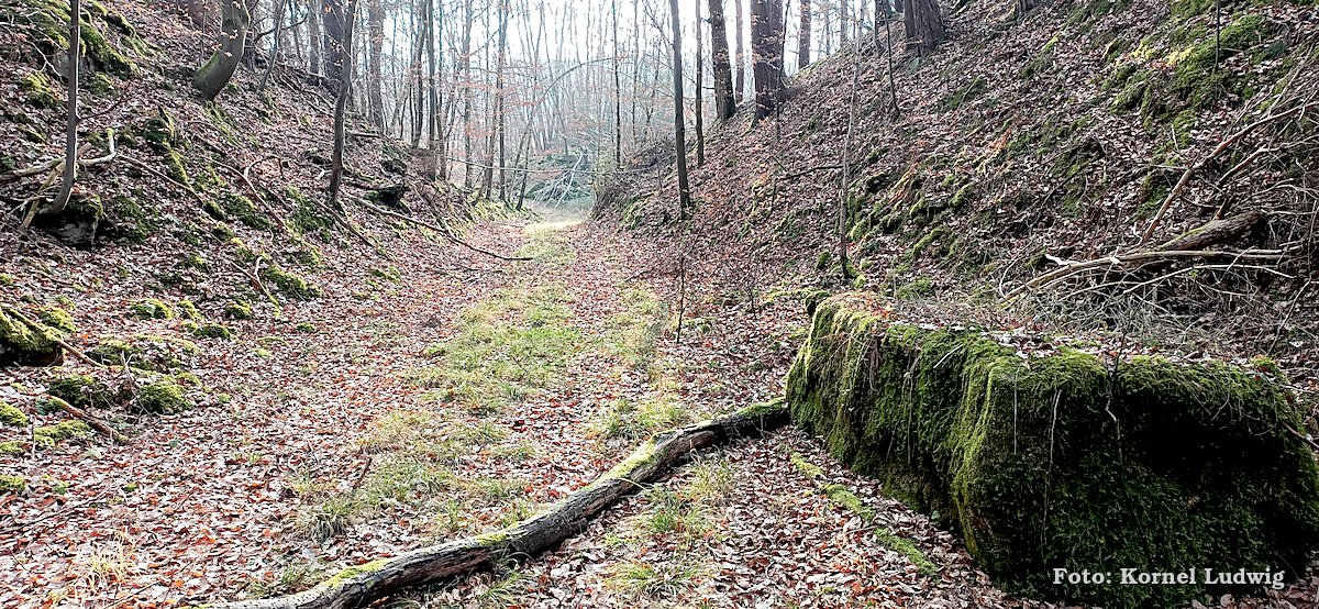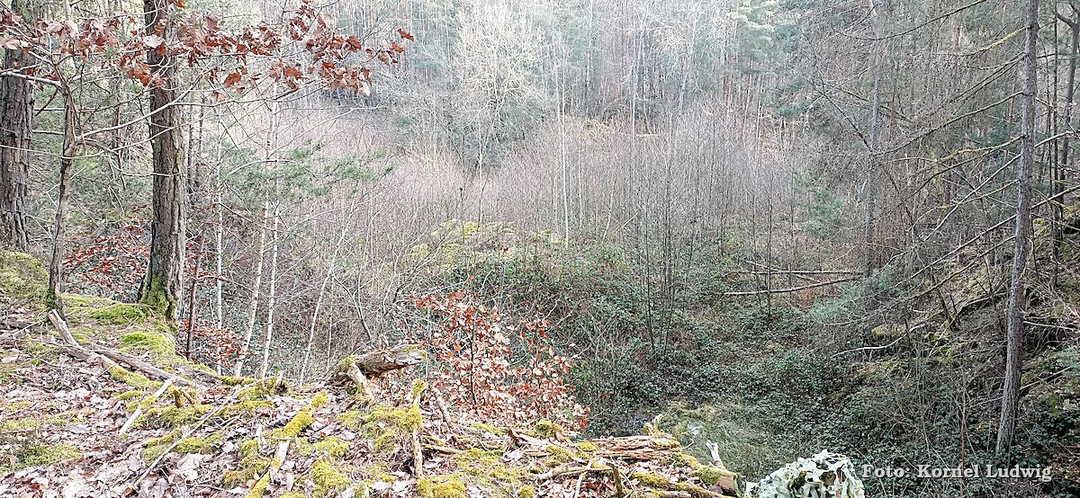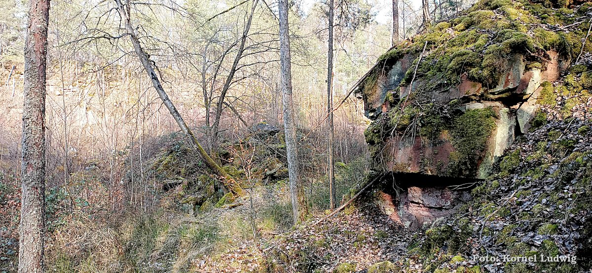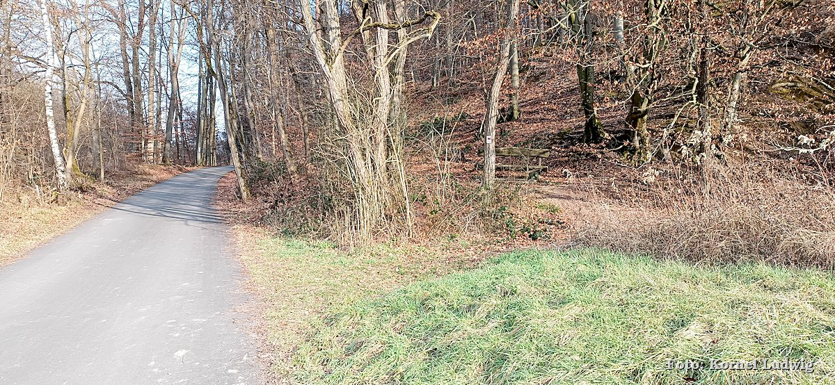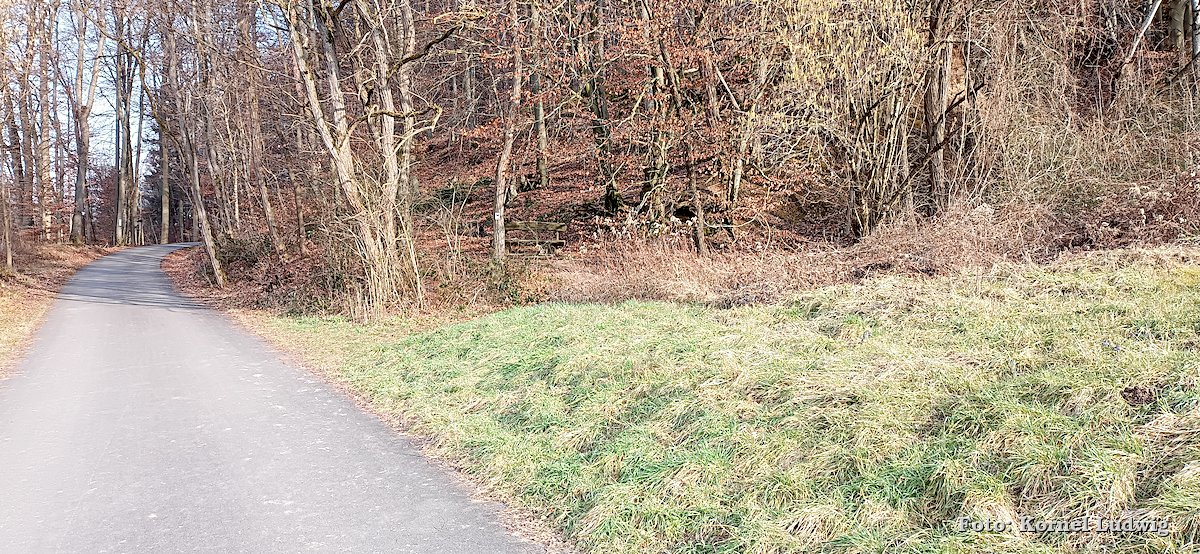 Nach dem Start am „Eisweiher“ geht es die ersten 800m auf einer für den Verkehr gesperrten Asphaltstrasse, über eine kleine Brücke, in Richtung Südosten und Paradeismühle. In ca. 700m teilt sich die Straße nach rechts, wo sich der Waldkindergarten befindet. Unser Weg führt allerdings geradeaus Richtung Waldrand, der in ca. 100m beginnt. Dort verlassen wir die Asphaltstrasse und biegen nach rechts in einen Waldweg ein. Dem Schmetterlingszeichen folgend, geht es von dort mäßig, aber stetig bergauf. Auf der rechts gelegen Talseite sieht man den Röllfelder Waldkindergarten liegen, bevor man nach ca. 1,6km Wegstrecke, den zugewachsenen Eingang zum „Linsenrain-Steinbruch“ erreicht.