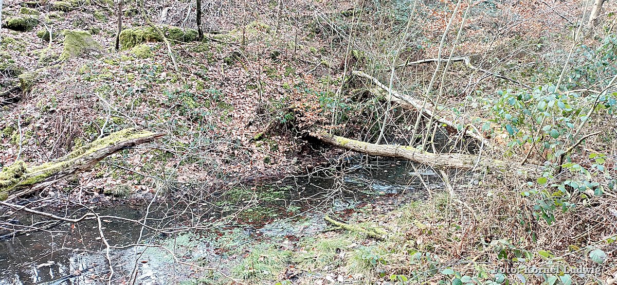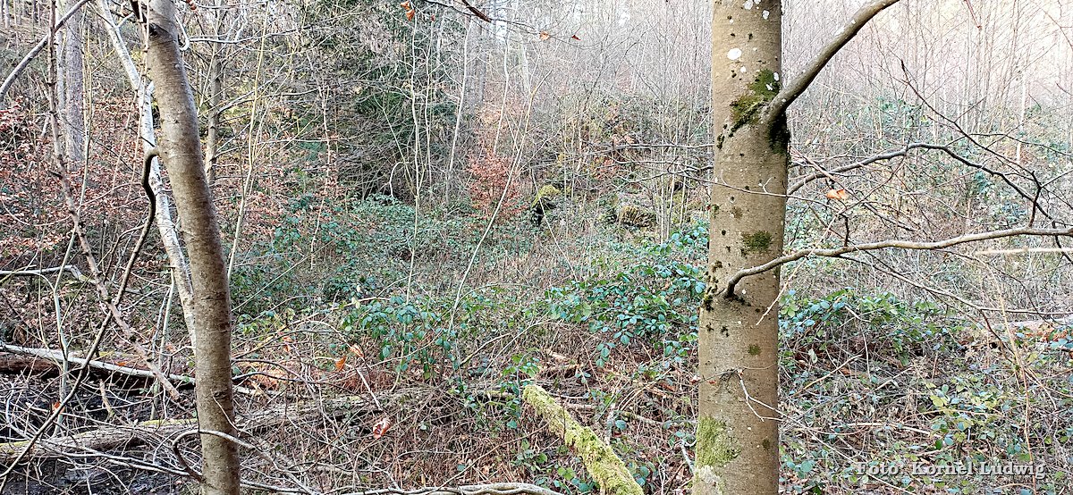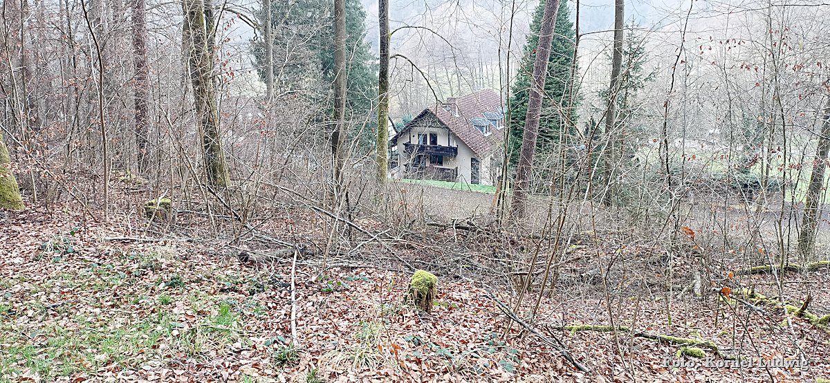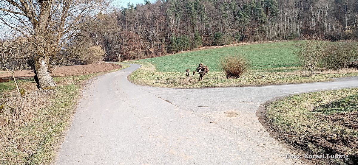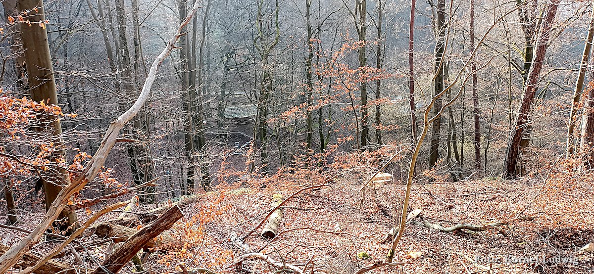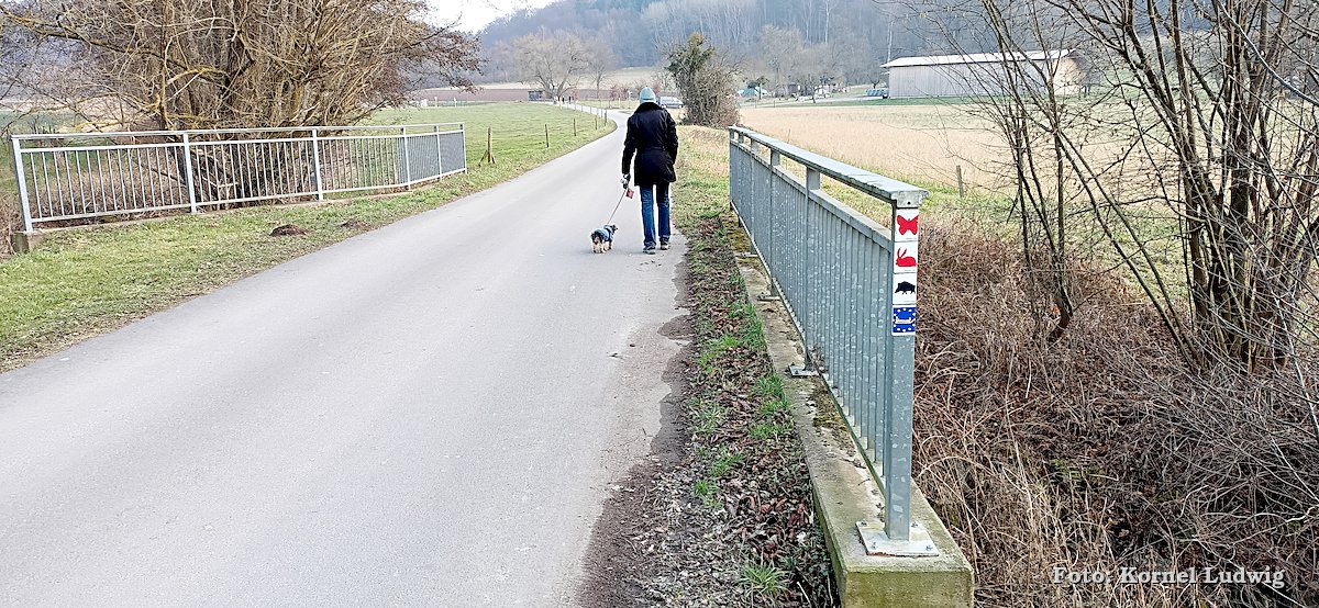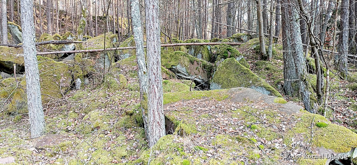Nach dem Start am „Eisweiher“ geht es die ersten 800m auf einer für den Verkehr gesperrten Asphaltstrasse, über eine kleine Brücke, in Richtung Südosten und Paradeismühle. In ca. 700m teilt sich die Straße nach rechts, wo sich der Waldkindergarten befindet. Unser Weg führt allerdings geradeaus Richtung Waldrand, der in ca. 100m beginnt. Dort verlassen wir die Asphaltstrasse und biegen nach rechts in einen Waldweg ein. Dem Schmetterlingszeichen folgend, geht es von dort mäßig, aber stetig bergauf. Auf der rechts gelegen Talseite sieht man den Röllfelder Waldkindergarten liegen, bevor man nach ca. 1,6km Wegstrecke, den zugewachsenen Eingang zum „Linsenrain-Steinbruch“ erreicht.