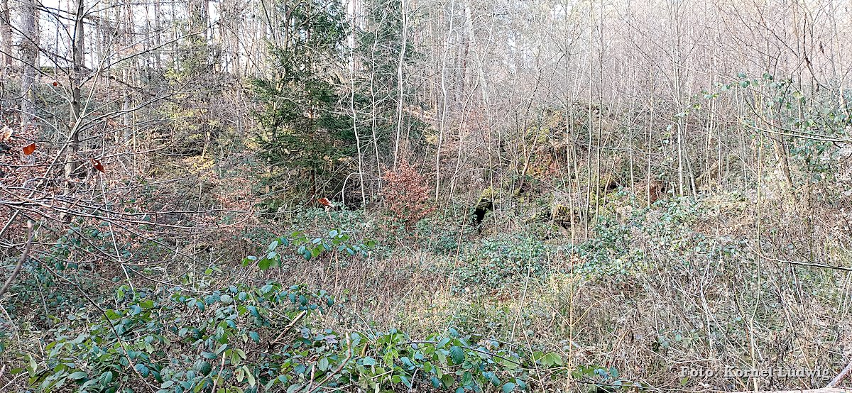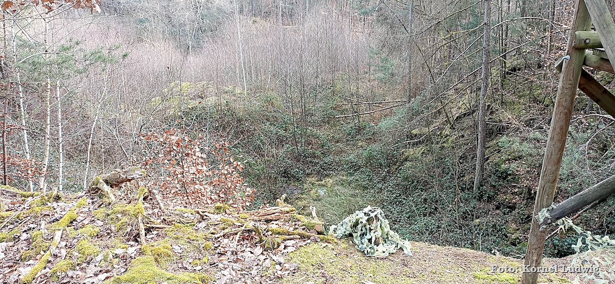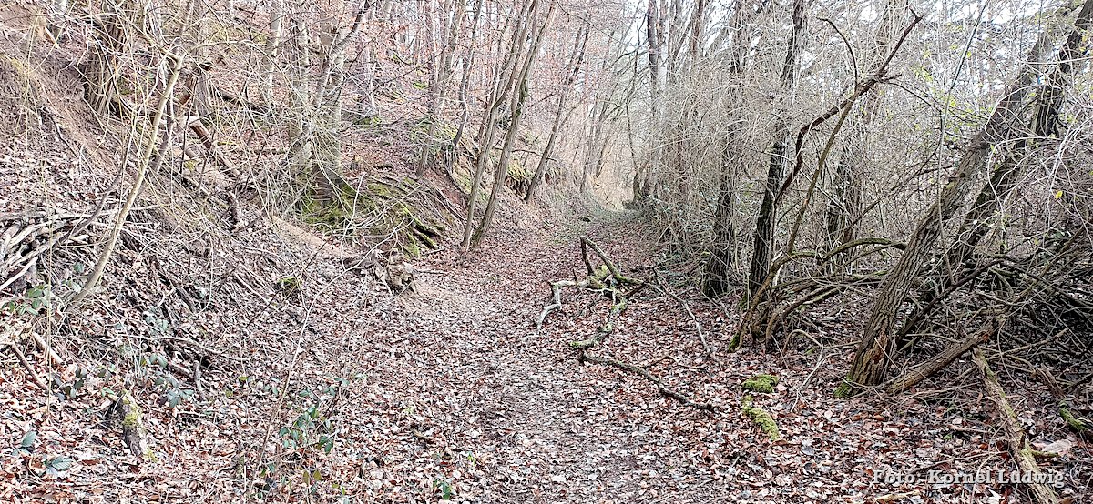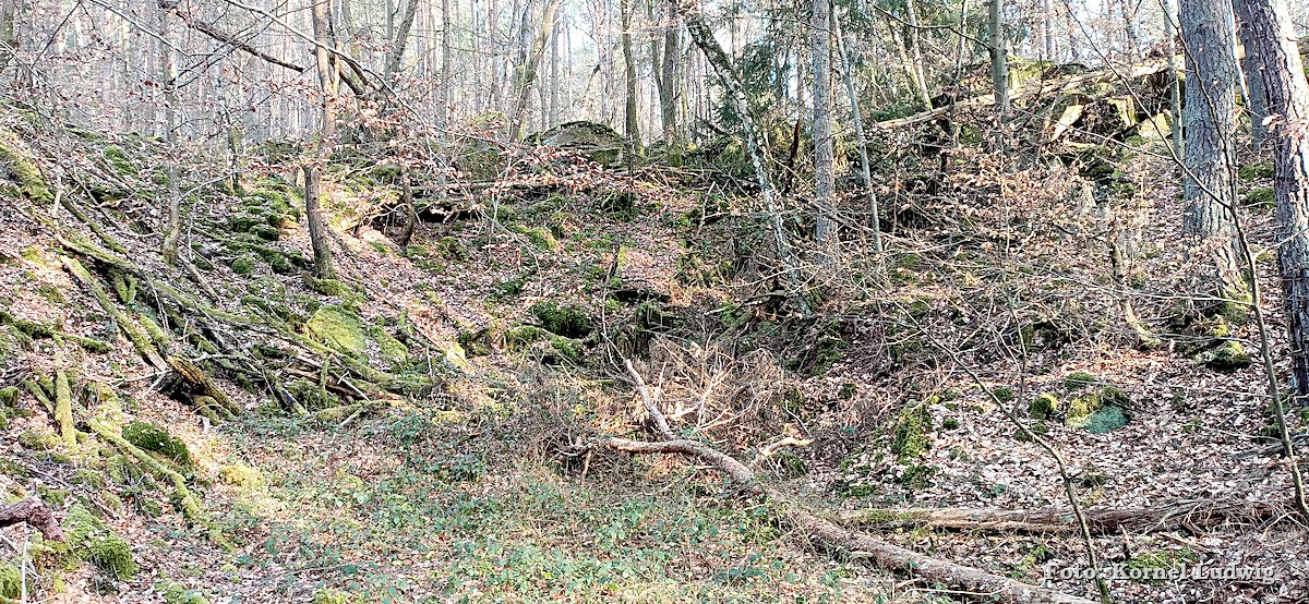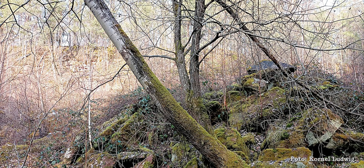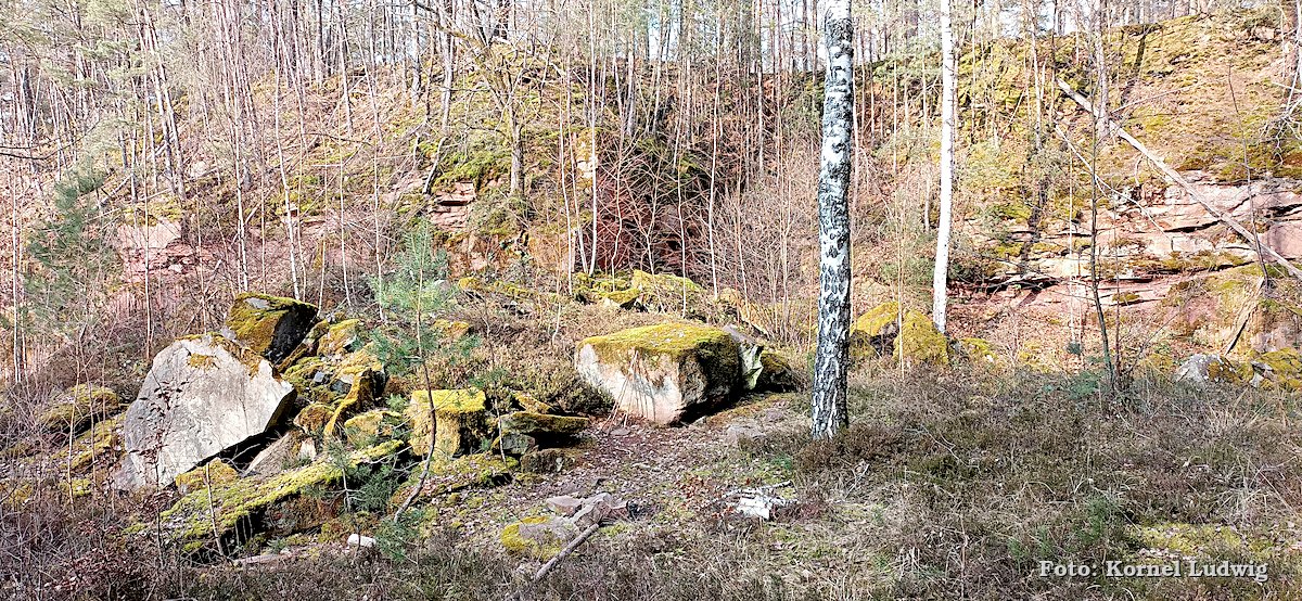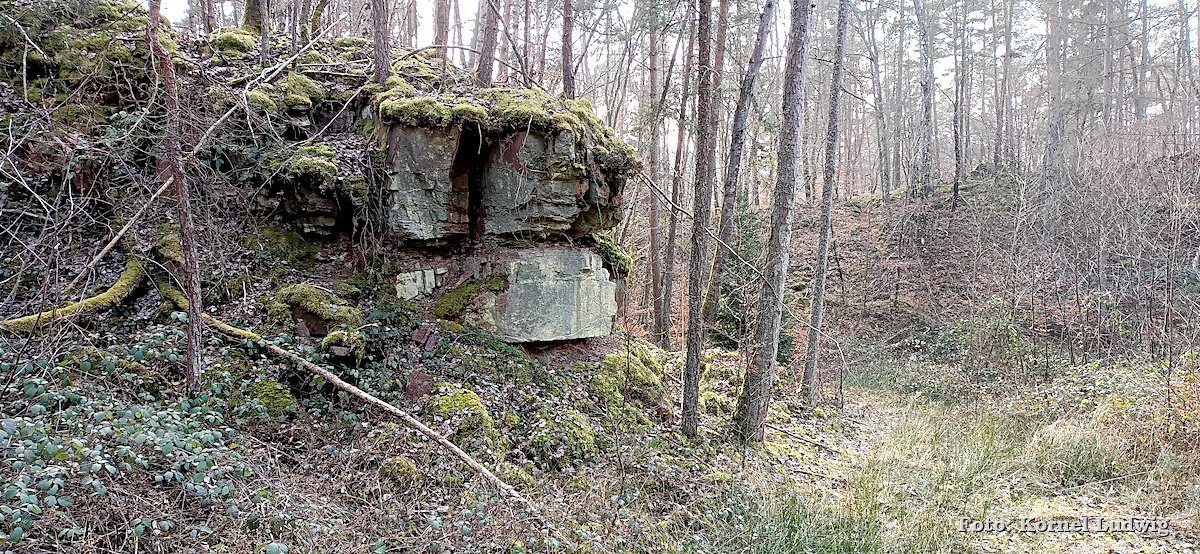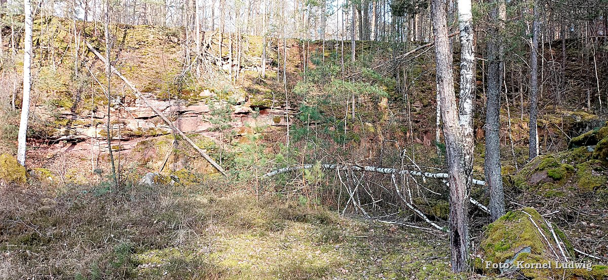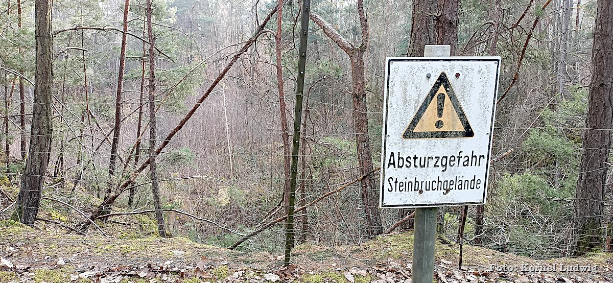 Vom Eingang des Steinbruches aus führt der Weg, weiter leicht ansteigend, auf der westlichen Seite um den Steinbruch herum, wo er nach ca. 500m an der nördlichen Abbruchkante des Steinbruchs vorbeiführt. Von dort kann man einen Blick in das Innere des langsam zuwachsenden Steinbruches werfen.