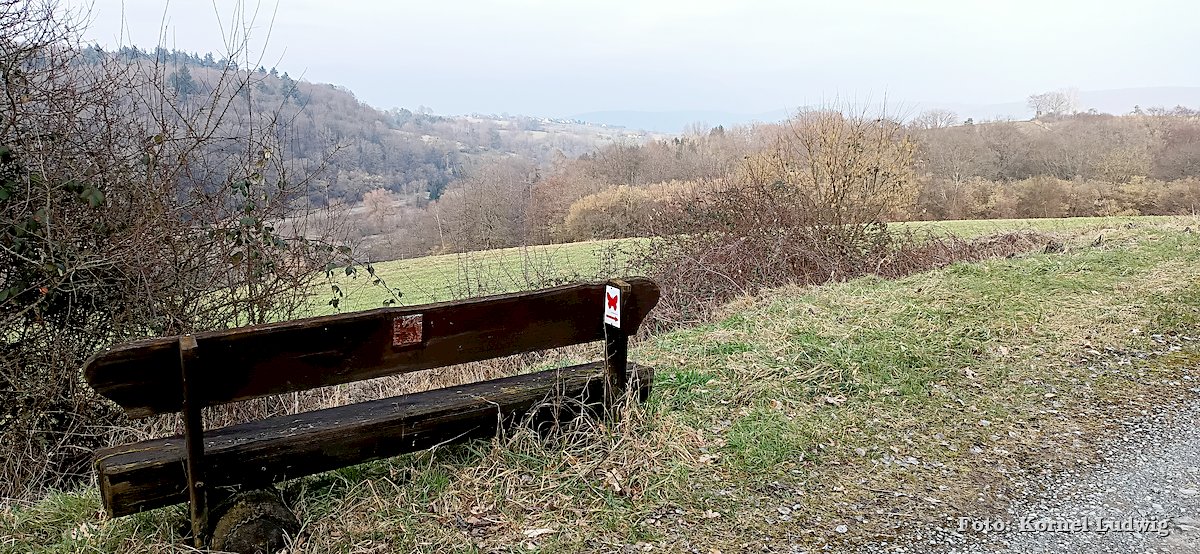 Durch lichten Mischwald führt das Schmetterlingszeichen weiter, bis der Weg nach weiteren ca. 600m aus dem Wald herausführt und einen herrlichen Ausblick auf Höhen und Täler des Spessarts freigibt. Im vorderen Tal liegt das Dorf Röllbach, dessen Kirchturmspitze knapp über den Hügel ragt. Links davon, auf der Anhöhe liegt das Dorf Schmachtenberg und ganz im Hintergrund, vor den bewaldeten Spessarthügeln grüßt der Höhenerholungsort Mönchberg. Eine Bank am Waldrand lädt dazu ein, hier eine Rast einzulegen und den herrlichen Blick zu genießen. An dieser Stelle ist übrigens auch der höchste Punkt der Wanderung (ca. 310m) erreicht und gleichzeitig die Hälfte der Wegstrecke (2,5km) zurückgelegt. Nach der Rast geht es von hier aus die zweite Hälfte des Wanderweges auf gut ausgebauten Schotter- und Asphaltwegen stetig bergab, vorbei an der im Tal gelegenen „Paradeismühle“, zurück zum Ausgangspunkt, am „Eisweiher“.